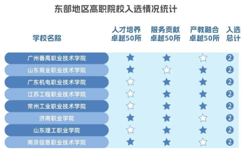 本年度报告在过往的指数研制与评选基础上进行优化,分为东部地区、中部和东北地区、西部地区,各评选出50所人才培养卓越高职院校、50所服务贡献卓越高职院校、50所产教融合卓越高职院校。东部地区共有17所高职院校入选三大卓越榜单,19所高职院校入选其中两个卓越榜单。