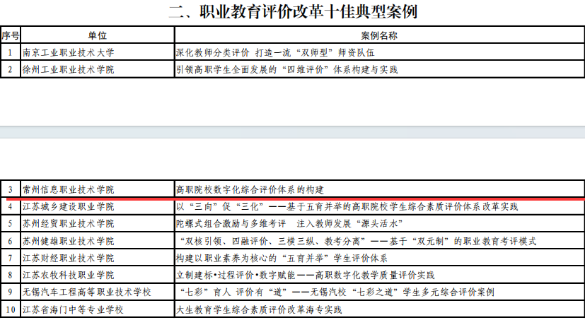 近日,江苏省教育厅公布2023年教育评价改革典型案例遴选结果,常州信息职业技术学院《高职院校数字化综合评价体系的构建》获评职业教育评价改革十佳典型案例。