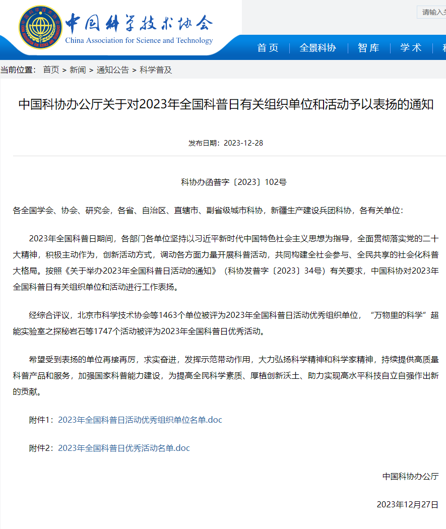 近日,中国科协对2023年全国科普日有关组织单位和活动进行工作表扬。常州信息职业技术学院参与主办的“2023年全国科普日活动—“追星科学家·擘画中国梦”科学家(精神)进校园系列行动”,参与协办的“我有一个院士梦”——2023年常州市“全国科普日”主场活动获评优秀活动。