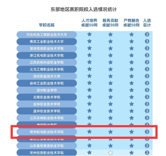 近日,由中国教育科学研究院编著、高等教育出版社出版的《2023中国职业教育质量年度报告》发布了人才培养卓越、服务贡献卓越、产教融合卓越高等职业学校三大榜单。常州机电职业技术学院荣膺东部地区高职院校人才培养50所、服务贡献50所、产教融合50所“全榜单”。