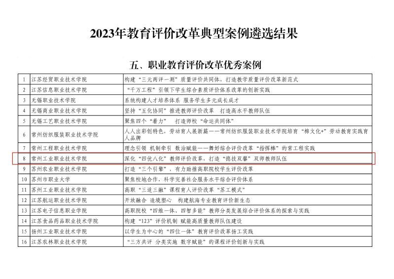 近日,江苏省教育厅发布了教育评价改革典型案例的评选结果,常州工业职业技术学院《深化“四优八化”教师评价改革,打造“德技双馨”双师教师队伍》案例成功入选江苏省职业教育评价改革优秀案例。