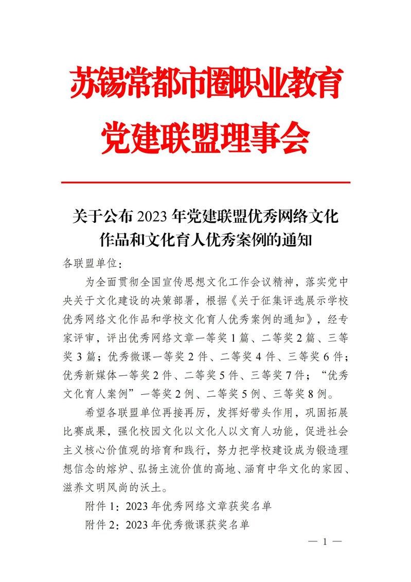 近日,苏锡常都市圈职业教育党建联盟理事会公布了2023年党建联盟优秀网络文化作品和文化育人优秀案例评选结果,我校获一等奖2项,二等奖2项,获奖数量和质量均排名第一。常州工业职业技术学院材料工程学院党总支潘逸制作的《育人以德 美德成林——志愿精神分享主题党课》获优秀微课一等奖,马克思主义学院党总支王士恒撰写的《三育协同,普职融通:太湖湾耕读学堂的实践育人探索》获优秀文化育人案例一等奖,材料工程学院党总支嵇天培撰写的《廿年相伴情绵长 安吾心处成故乡》获优秀网络文章二等奖,旅游与康养学院党总支王润滋制作的《大山里的小园丁》获优秀新媒体二等奖。