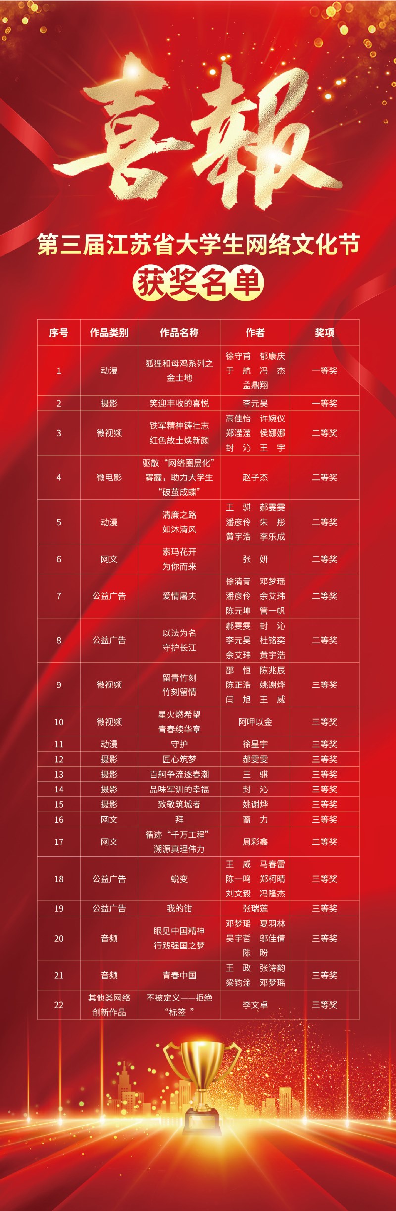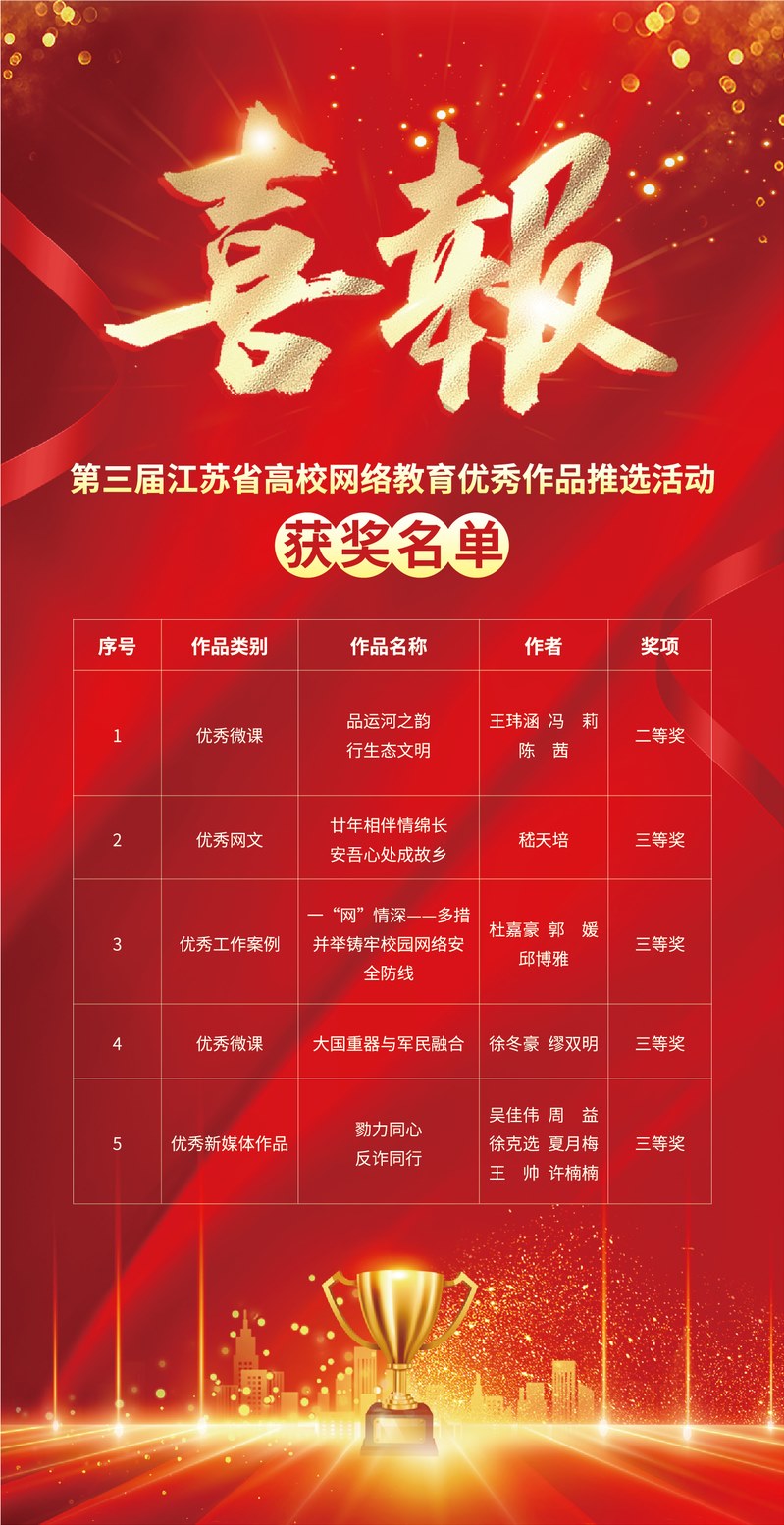 本届江苏省大学生网络文化节和高校网络教育优秀作品推选展示活动于2023年10月中旬启动,以“争做校园好网民,汇聚网络正能量,挺膺担当建新功”为主题,面向全省高校师生征集作品。“大学生网络文化节”征集微视频、微电影、动漫、摄影、网文、公益广告、音频、校园歌曲、其他类网络创新作品9类作品,“高校网络教育优秀作品推选展示活动”征集优秀网络文章、优秀工作案例、优秀微课、优秀新媒体作品4类作品。学校积极响应,精心组织,广泛动员全校师生参与。经过校内遴选,共推荐60件师生作品参与省赛。
