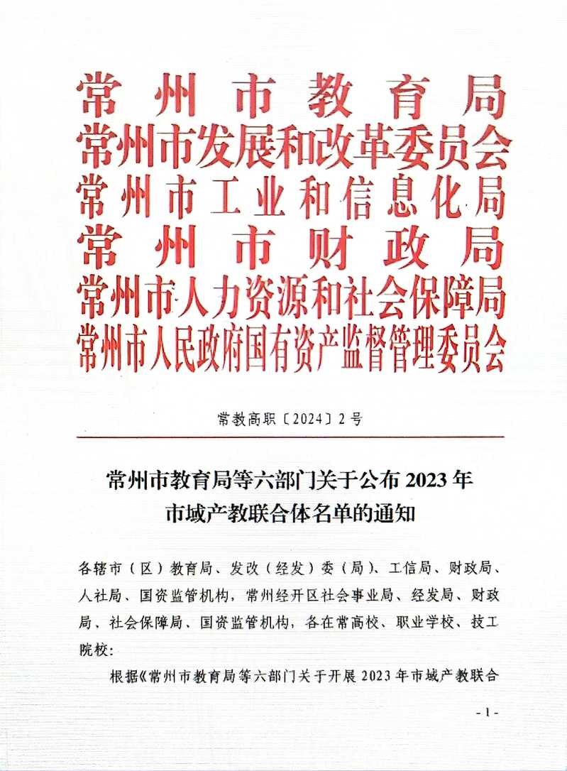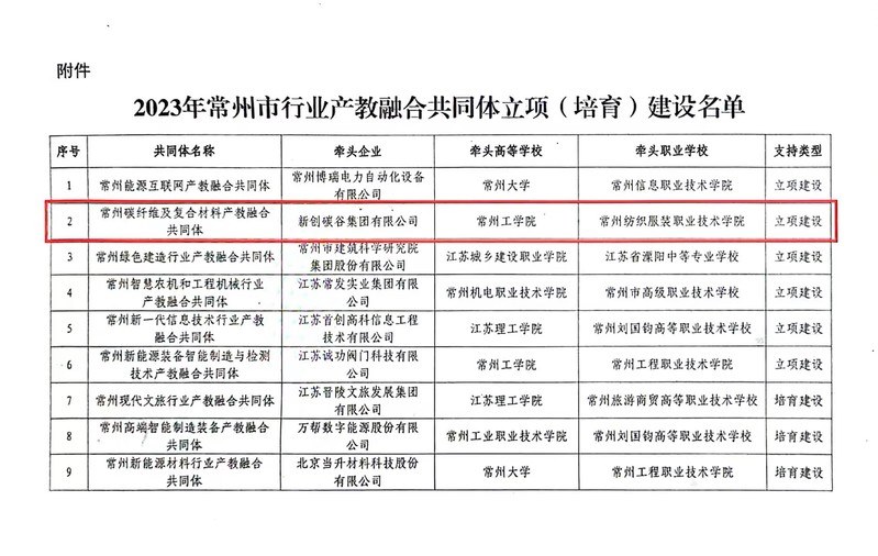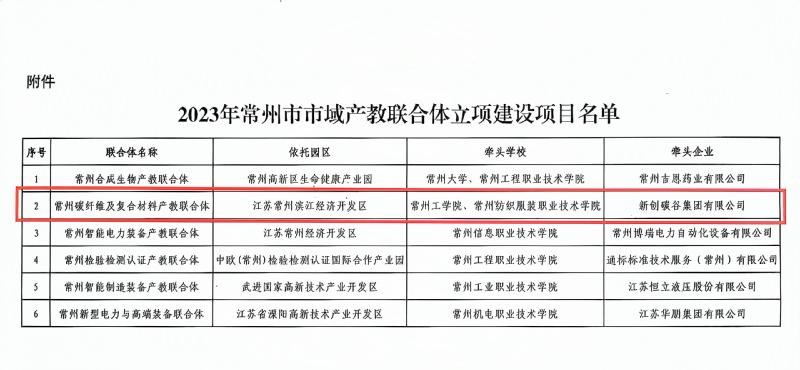 近日,根据《常州市教育局等七部门关于公布2023年常州市行业产教融合共同体立项(培育)建设名单的通知》和《常州市教育局等六部门关于公布2023年市域产教联合体名单的通知》,常州纺织服装职业技术学院牵头成立的常州市碳纤维及复合材料产教融合共同体项目和与常州工学院共同牵头的常州碳纤维及复合材料产教联合体项目双双获批立项。