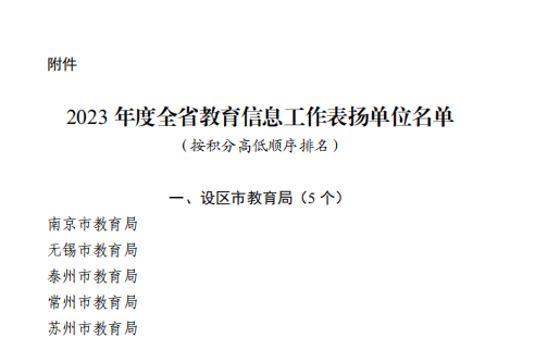 近日,江苏省教育厅发布《2023年度全省教育信息工作情况通报》,对包括5个设区市教育局、22个县(市、区)教育局、10所本科院校和15所高职(专科)院校进行表扬。常州信息职业技术学院获评“全省教育信息工作表扬单位”称号。