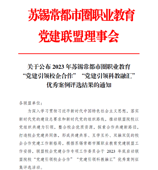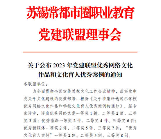 近日,苏锡常都市圈职业教育党建联盟理事会公布了2023年优秀“党建引领校企合作”“党建引领科教融汇”优秀案例以及网络文化作品和文化育人优秀案例评选结果,常州机电职业技术学院获一等奖1项、二等奖2项、三等奖2项。其中,机关党总支第六党支部报送的《党建引领“五链”耦合,提升政校企合作效能》获优秀案例一等奖;马克思主义学院党总支谭喻天、薛梦霞的《你我携手同行共筑国家安全“钢铁长城”——坚持总体国家安全》获优秀微课作品二等奖;电气党总支李兵、王云霞、郝旻霄的《深度植根青年圈层 打造网络思政“同心圆”——电气工程学院网络育人工作案例》获优秀文化育人案例二等奖;机关党总支孙晓瑨的《植树节 漫画》获优秀新媒体作品三等奖;机关党总支陈翼的《百炼成钢 凯歌而行》获优秀网络文章三等奖。