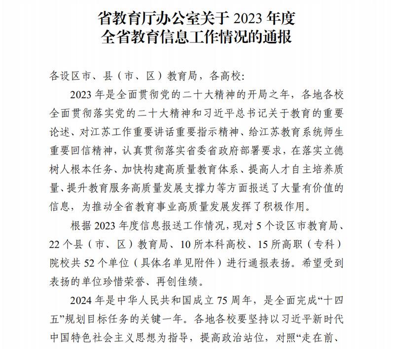 近日,江苏省教育厅办公室发布《关于2023年度全省教育信息工作情况的通报》,常州工业职业技术学院获评“2023年度全省教育信息工作表扬单位”称号。这是学校自2017年起连续7年获此殊荣。