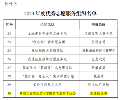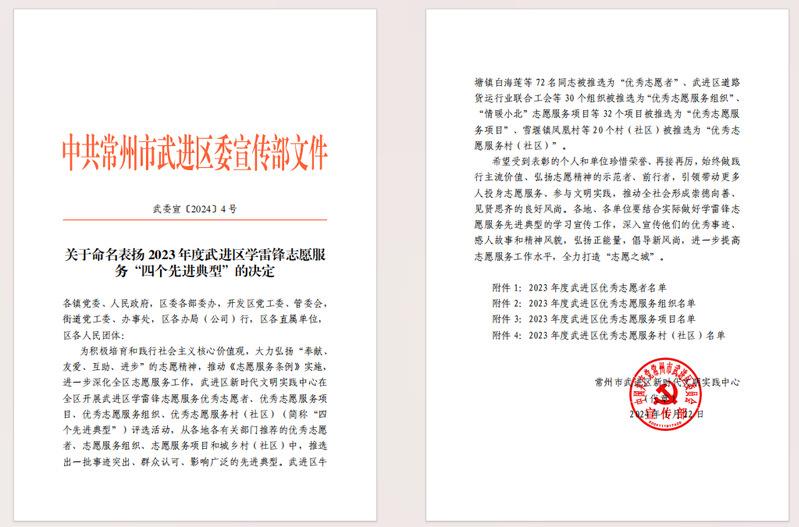 此外,在武进区委宣传部、区新时代文明实践中心发布的武进区学雷锋志愿服务“四个先进典型”评选中,学校青年志愿者协会获评年度优秀志愿服务组织。