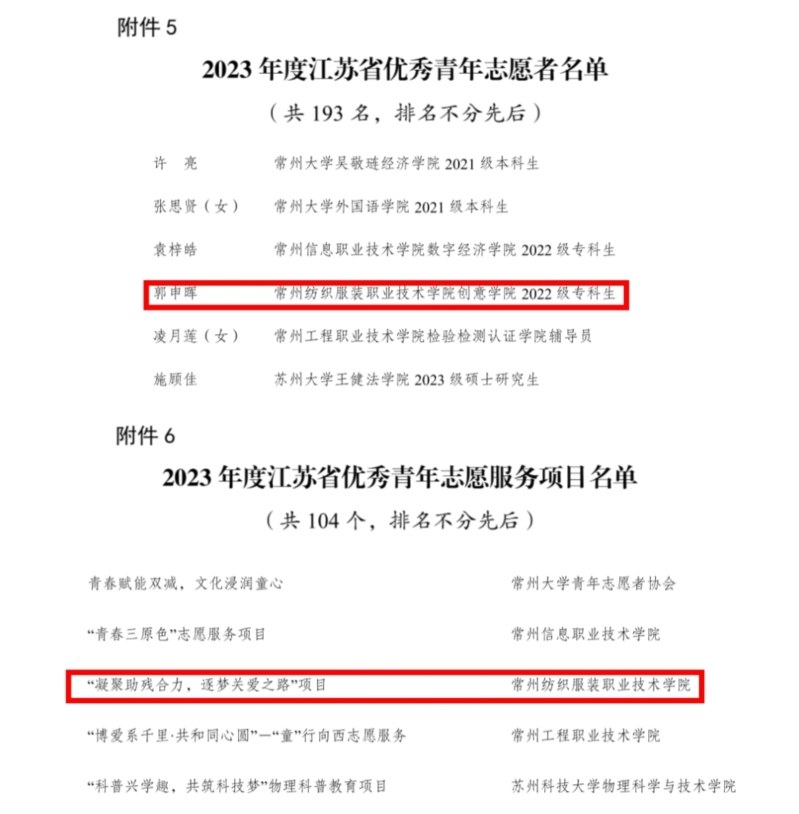 近日,共青团江苏省委、江苏省青年志愿者协会公布了2023年度全省青年志愿者行动先进典型评选结果。常州纺织服装职业技术学院创意设计学院郭申晖获评2023年度江苏省优秀青年志愿者;我校智能纺织与材料学院“凝聚助残合力,逐梦关爱之路”项目获评2023年度江苏省优秀青年志愿服务项目。