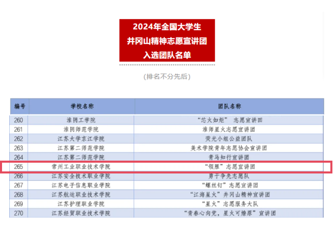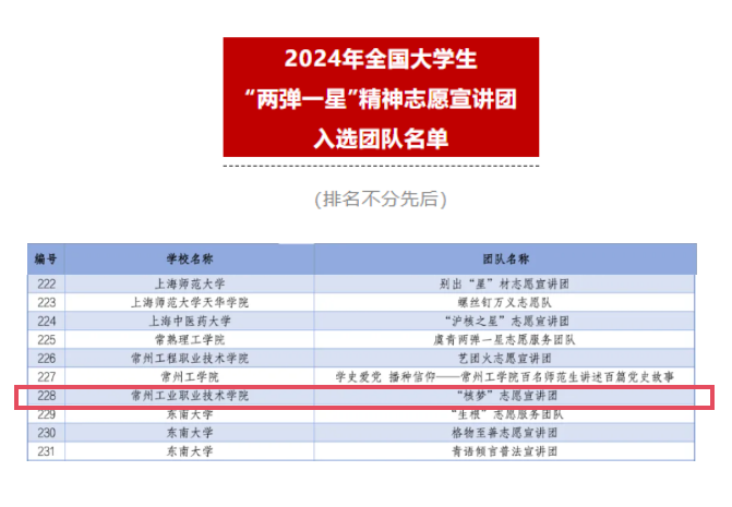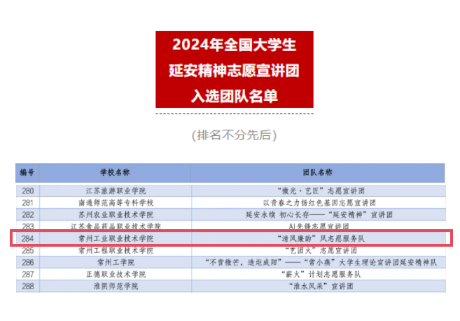 近日,团中央青年志愿者行动指导中心面向全国高校组织开展了2024年全国大学生井冈山精神、延安精神、“两弹一星”精神志愿宣讲团的遴选工作。常州工业职业技术学院数字商务学院“清风廉韵”风志愿服务队、旅游与康养学院“领雁”志愿宣讲团、“核梦”志愿宣讲团从全国数千支宣讲队伍中脱颖而出,顺利入选三类专项宣讲活动。