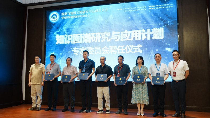 东南大学江北创新研究院副院长蒋德魁教授与全国电商行指委陆春阳主任为“数据与知识工程研究中心”成立揭牌,并为“知识图谱研究与应用计划”专家委员会颁发聘书,周庆元当选为“知识图谱研究与应用计划”专家委员会副主任委员。