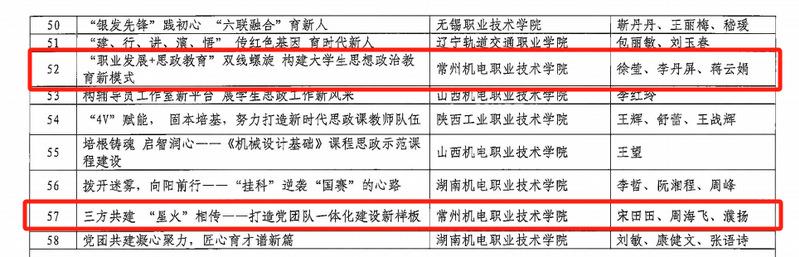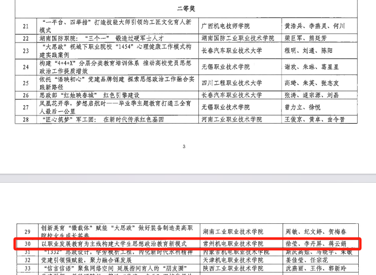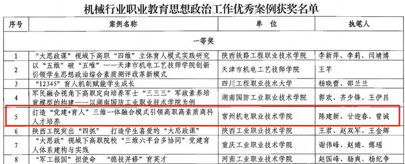 近日,经组织推荐、资格审核、专家遴选等程序,中国机械工业职工思想政治工作研究会对2024年度全国机械行业思想政治工作优秀案例遴选结果予以发布,常州机电职业技术学院共有5个项目获奖,其中一等奖1项、二等奖3项、三等奖1项。