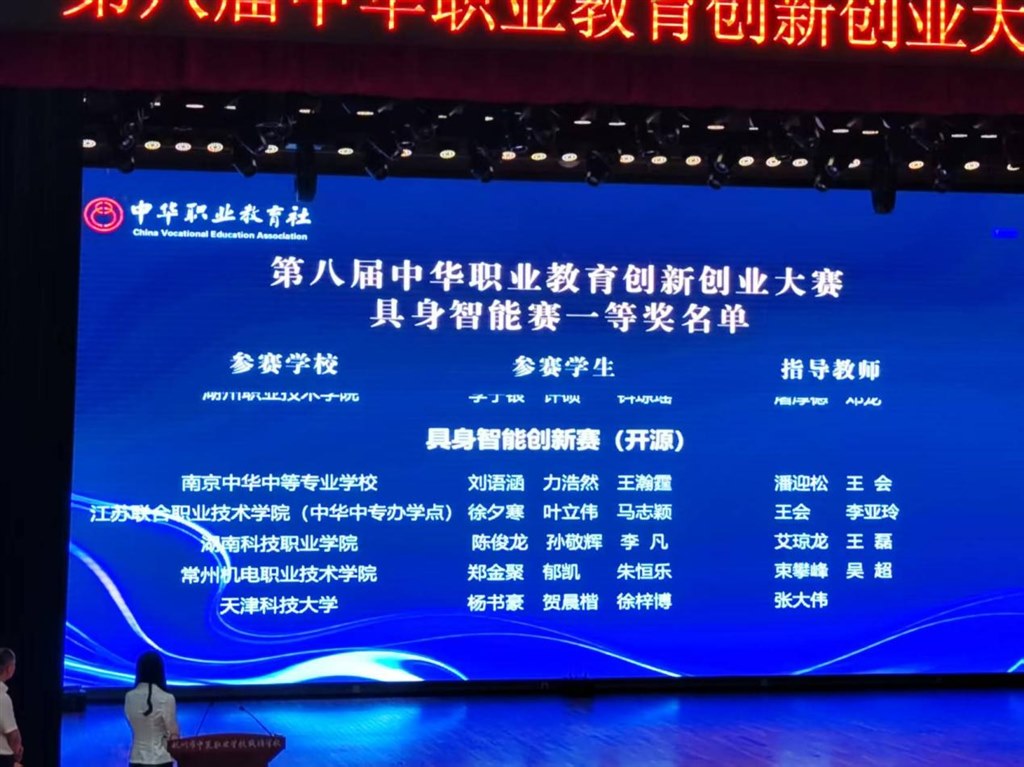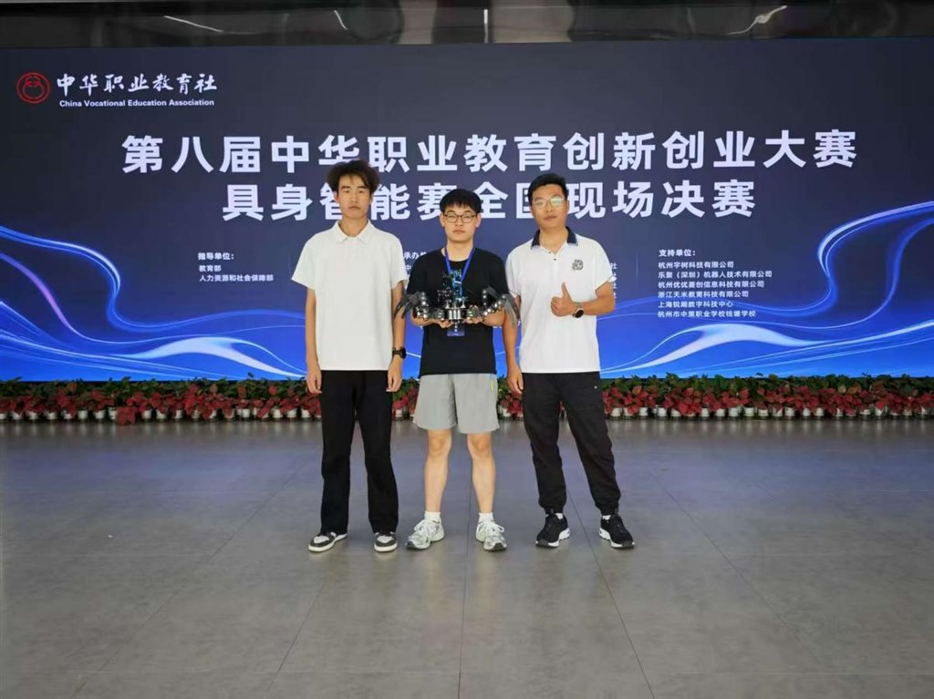 7月10日-12日,第八届中华职业教育创新创业大赛具身智能赛全国现场决赛在浙江省杭州市落幕。常州机电职业技术学院电气工程学院学生郑金聚、郁凯、朱恒乐在具身智能创新赛(开源)中荣获全国一等奖。