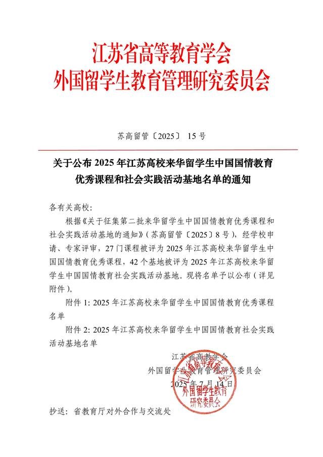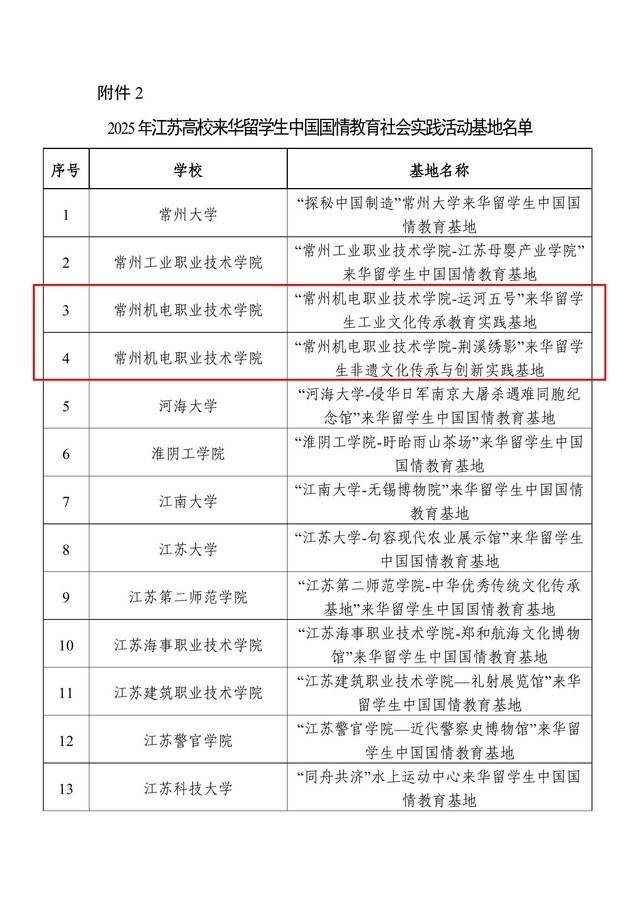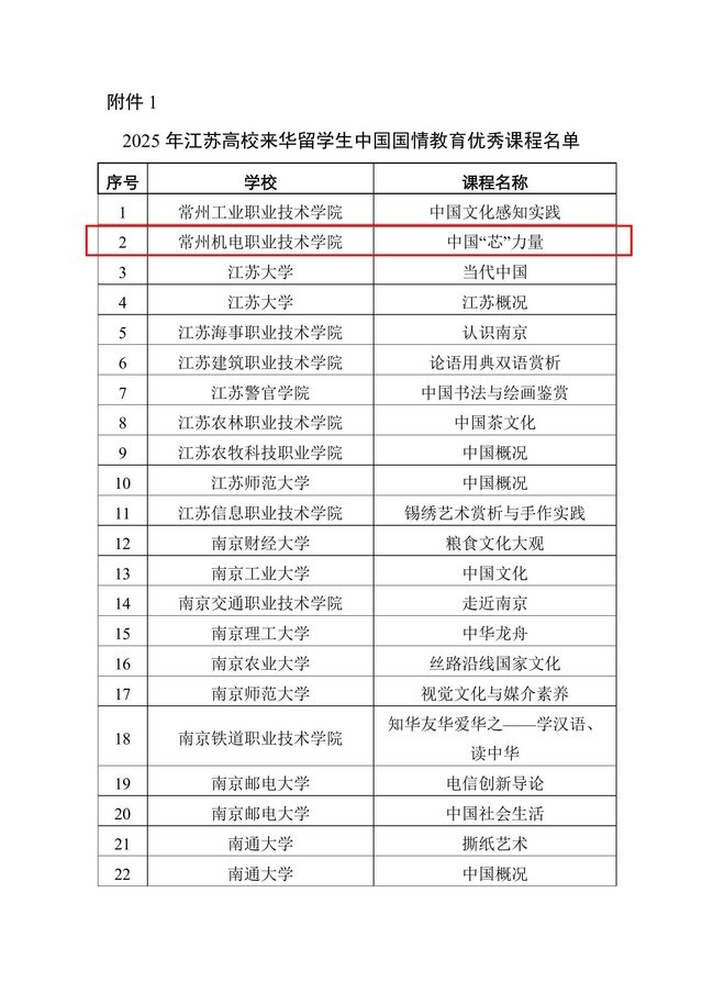 近日,江苏省高等教育学会外国留学生教育管理研究委员会公布2025年江苏高校来华留学生中国国情教育优秀课程和社会实践活动基地名单。常州机电职业技术学院信息工程学院申报的《中国“芯”力量(China's Chip Power)》入选中国国情教育优秀课程。机械工程学院牵头申报的“常州机电职业技术学院-运河五号”来华留学生工业文化传承教育实践基地、经济管理学院与合作企业联合申报的“常州机电职业技术学院-荆溪绣影”来华留学生非遗文化传承与创新实践基地,共同获批江苏高校第二批来华留学生中国国情教育社会实践活动基地。目前,我校已获批3个省级来华留学生中国国情教育社会实践活动基地,彰显了学校在来华留学生教育领域的深厚积淀与创新实力。