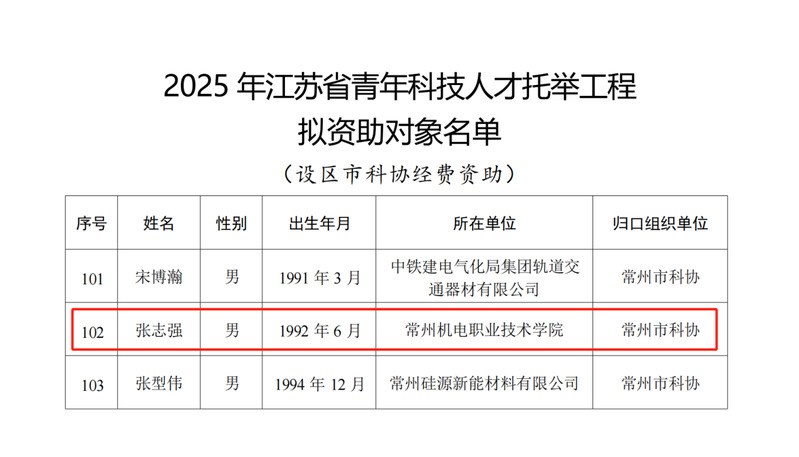 近日,2025年江苏省青年科技人才托举工程资助对象评选推荐结果公布。经各省级学会、省部属企事业单位、高校和设区市科协广泛发动,多渠道申报,专家评审,常州机电职业技术学院青年博士张志强成功入选。
