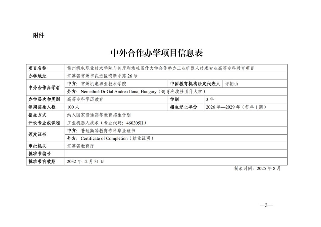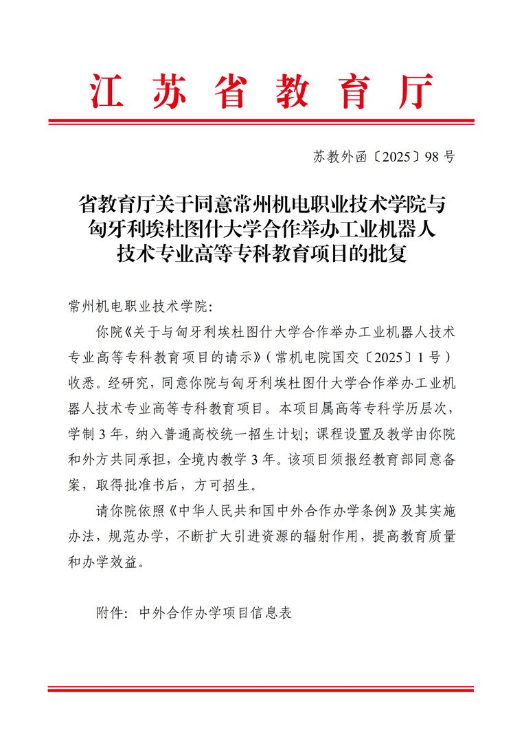近日,江苏省教育厅正式批复,同意常州机电职业技术学院与匈牙利埃杜图什大学合作举办工业机器人技术专业高等专科教育项目。这是继2023年12月学校与俄罗斯陶里亚蒂国立大学合作举办计算机网络技术专业高等专科教育项目获批之后,成功落地的第二个中外合作办学项目。