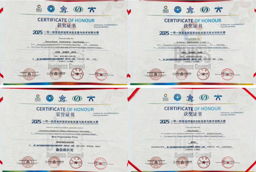 大赛以“未来技能,创造未来”为主题,吸引了全国26个省市高校的177支队伍参赛,赛项分为中职组和高职组(包含高职本科)两个组别。经激烈角逐,常州机电职业技术学院电气工程学院机电2335班学生郑守棋获一等奖,机电2431班学生俞佩云获三等奖,电气工程学院教师杨平华获评优秀指导教师,学校获评最佳组织奖。