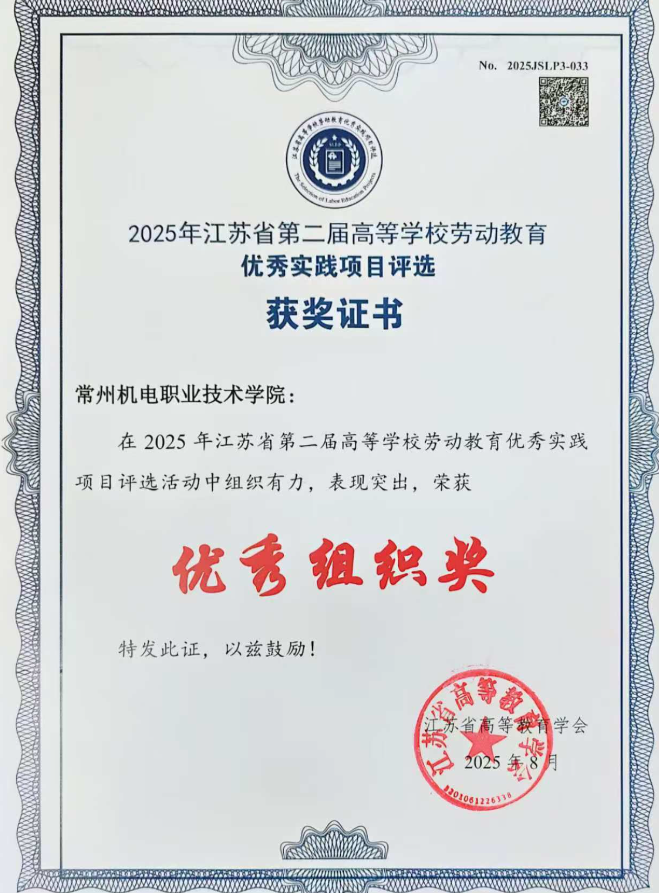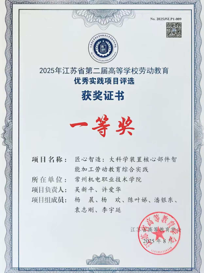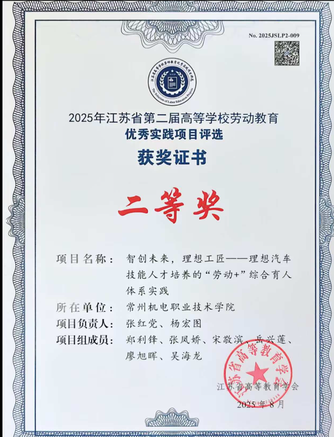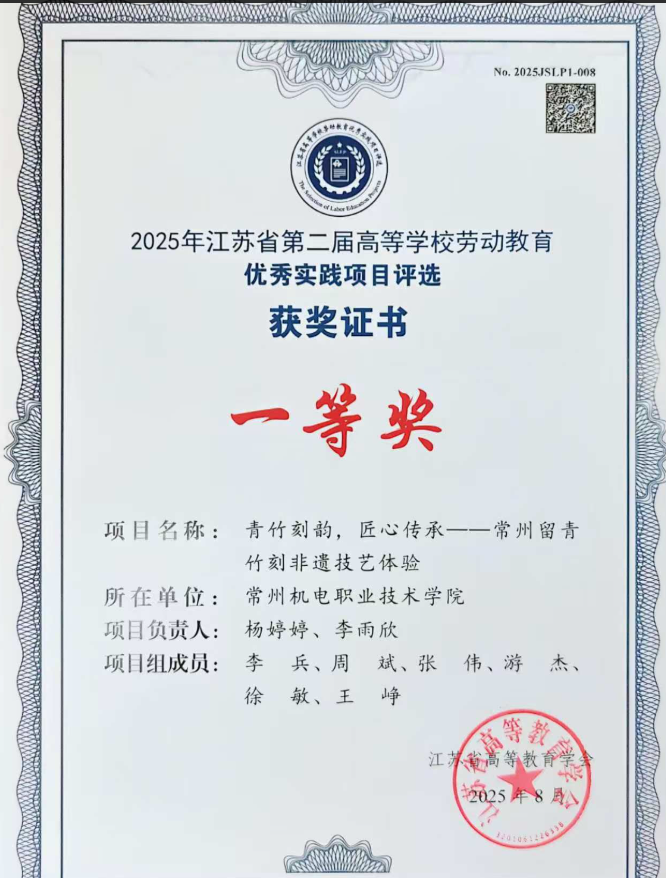 近日,在2025年江苏省第二届高等学校劳动教育优秀实践项目评选中,常州机电职业技术学院报送的《青竹刻韵,匠心传承——常州留青竹刻非遗技艺体验》《匠心智造:大科学装置核心部件智能加工劳动教育综合实践》荣获一等奖,《智创未来,理想工匠——理想汽车技能人才培养的“劳动+”综合育人体系实践》荣获二等奖,学校获优秀组织奖。