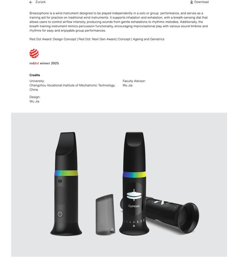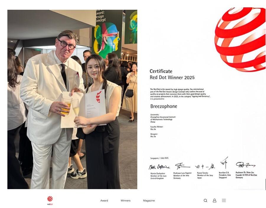 10月15日,德国红点设计奖颁奖典礼在新加坡首都剧院举行。常州机电职业技术学院创意设计学院工业设计专业教师巫佳的作品《Breezophone》荣获“红点设计概念奖”。