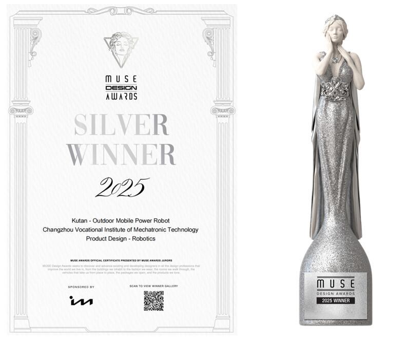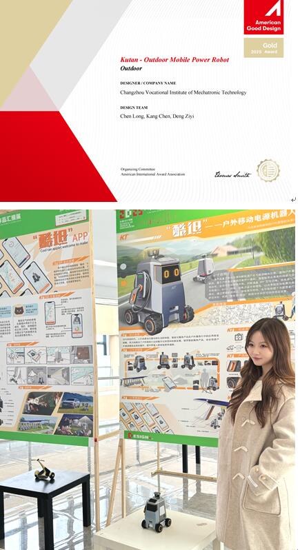 近日,由创意设计学院教师陈龙、康晨指导,常州机电职业技术学院2022级工业设计专业学生邓子依的作品《Kutan - Outdoor Mobile Power Robot》从全球100多个国家数万件参赛作品中脱颖而出,荣获2025年美国缪斯设计奖(MUSE Design Awards)银奖及美国好设计奖(American Good Design)金奖,在国际设计舞台上展现了我校师生的优秀创意与设计实力,实现了学校在该类奖项上的突破。