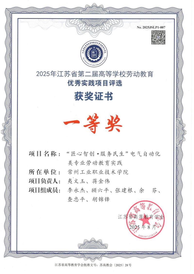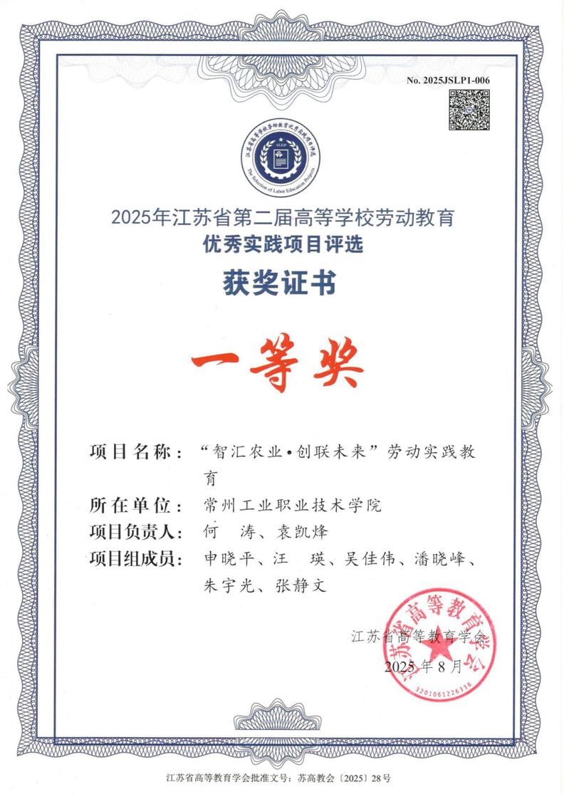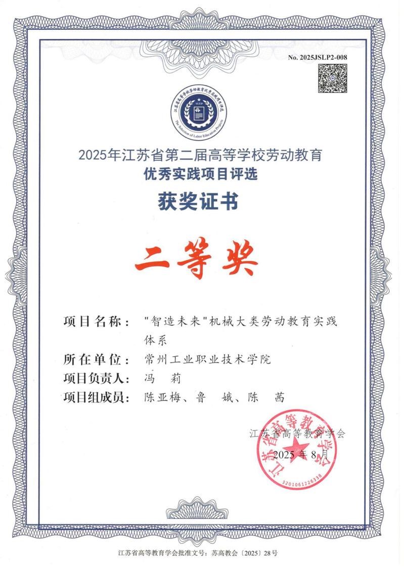 近日,江苏省高等教育学会2025年高等学校劳动教育优秀实践项目评选结果出炉,常州工业职业技术学院信息工程学院何涛、袁凯烽,智能控制学院夷文玉、蒋金伟的项目获一等奖,机械与交通学院冯莉的项目获二等奖。同时,学校荣获江苏省第二届高等学校劳动教育优秀实践项目评选活动优秀组织奖。