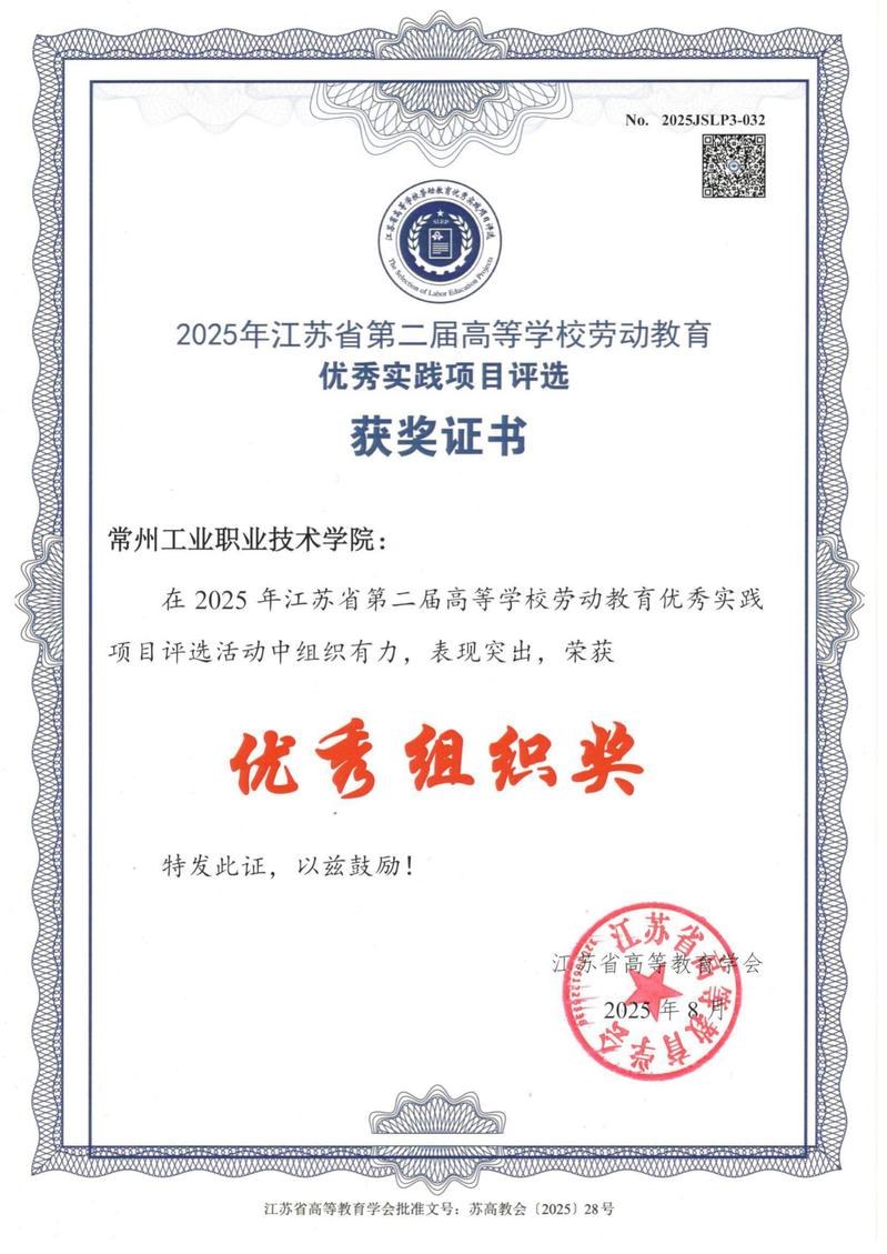 本次获奖是学校系统化推进劳动教育设计与实践的代表性成果,集中体现了学校教育教学改革的成效。近年来,学校围绕马克思主义劳动观、劳动精神、劳模精神、工匠精神、劳动法规教育及劳动实践等,全面开设劳动教育课程,推动校级劳动教育实践基地立项、建设与验收,并开展优秀实践项目遴选与推荐。学校将始终坚持立德树人根本任务,紧扣新时代人才培养要求,持续优化劳动教育顶层设计,不断拓展劳动教育内涵与实践形式,加快构建具有本校特色的劳动教育体系,为学校高质量发展注入新动力。(来源:常州工业职业技术学院)
