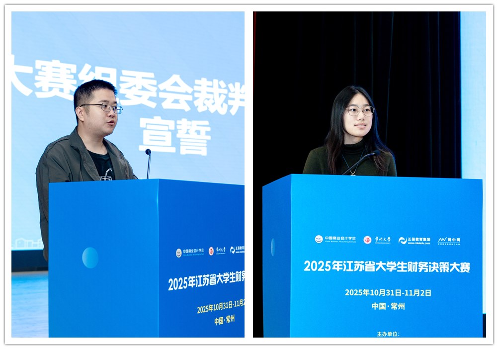 裁判长代表全体裁判员庄严宣誓,承诺严守竞赛规则,公正执裁。常州大学会计专业2023级朱紫漪同学代表全体参赛学子宣誓,表达了遵守规则、诚信竞赛、奋勇争先的决心。