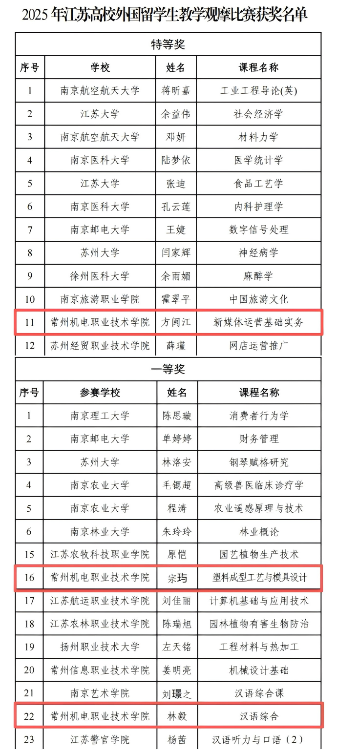 11月29日,由江苏省教育厅指导、省高等教育学会外国留学生教育管理研究委员会主办的2025年江苏高校外国留学生教学观摩比赛在南京举办。常州机电职业技术学院教师再创佳绩,在全省64所高校170余名参赛选手中脱颖而出。其中,经济管理学院教师方闽江获特等奖,模具技术学院教师宗玙、通识部教师林毅获一等奖,学校获“优秀组织奖”,该奖项全省仅15所高校获评,高职院校仅2所入选。