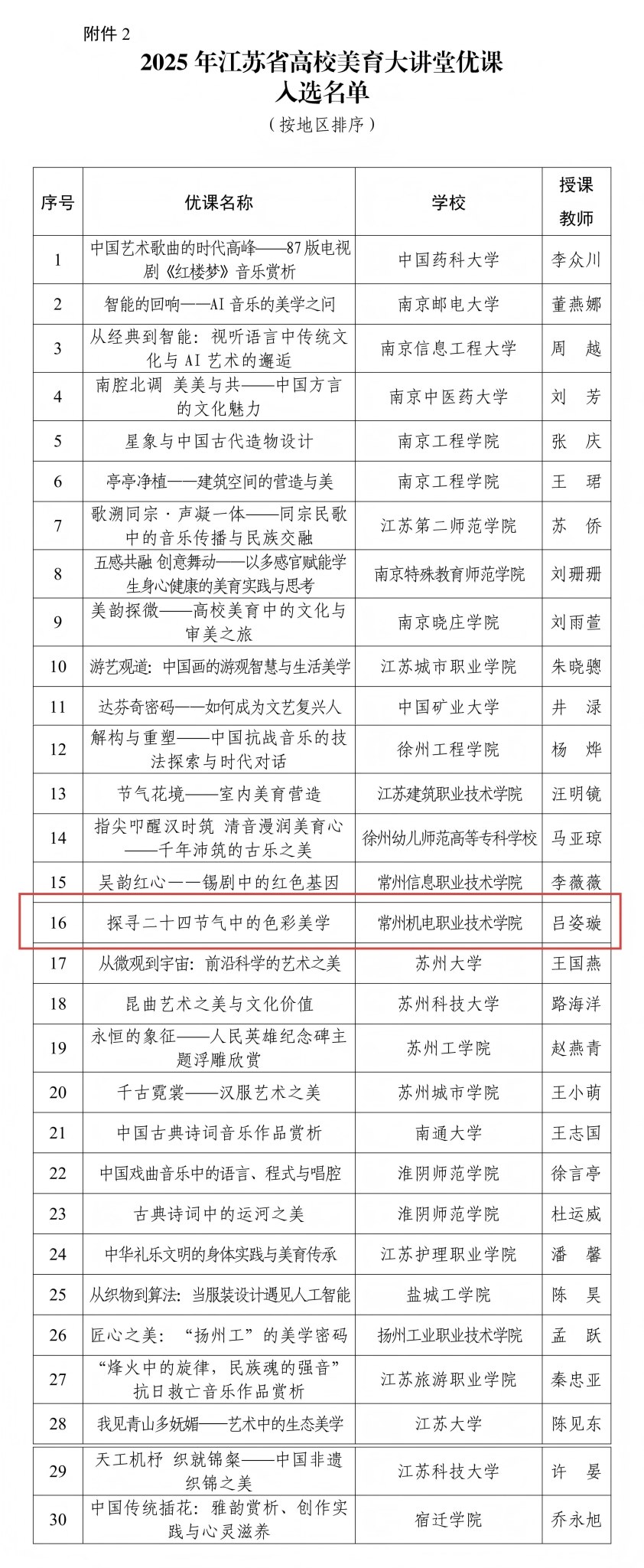 12月16日,江苏省教育厅公示了2025年江苏省高校美育大讲堂优课入选名单,共有30门课程入选。由常州机电职业技术学院团委兼职副书记、创意设计学院辅导员吕姿璇讲授的优课《探寻二十四节气中的色彩美学》在全省85所高校推荐的132门课程中脱颖而出,成功入选。