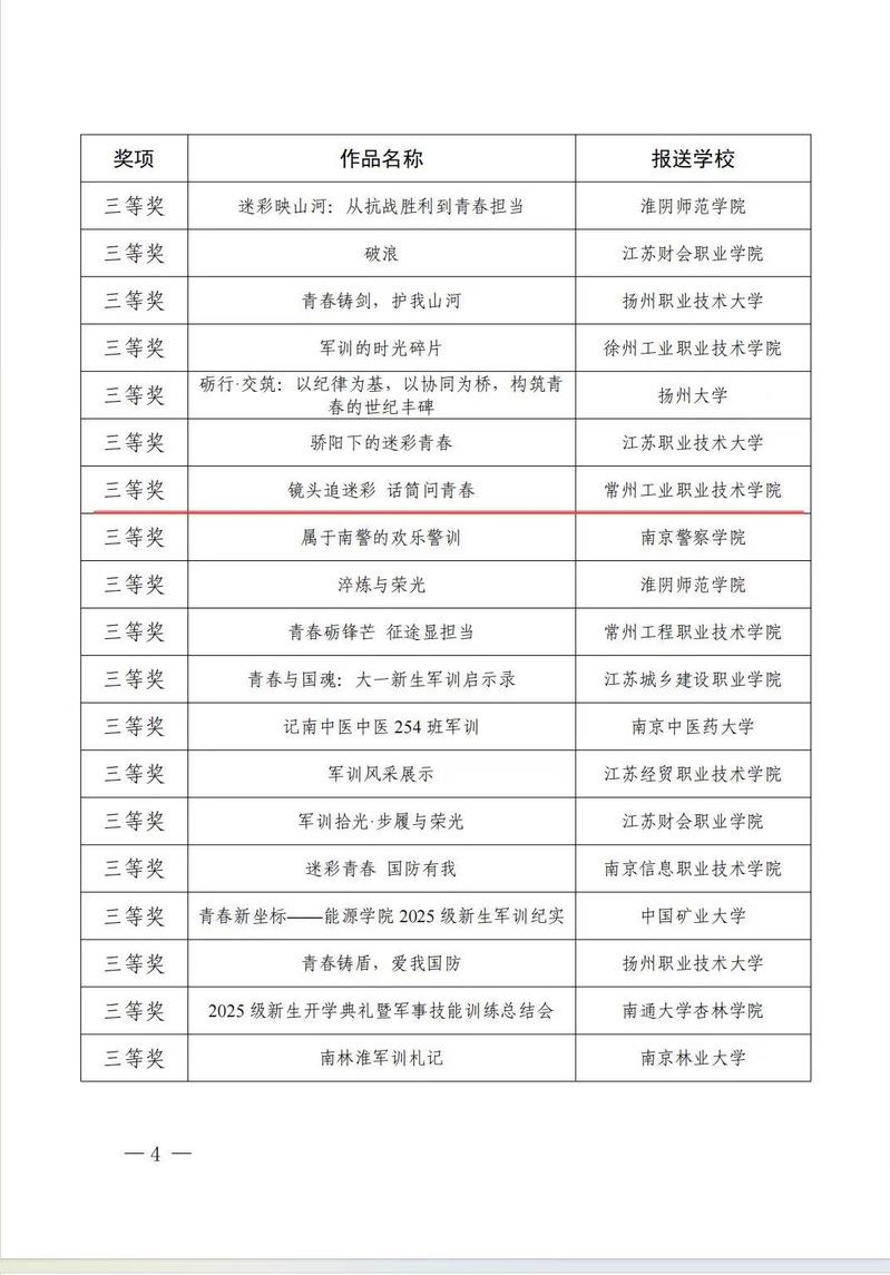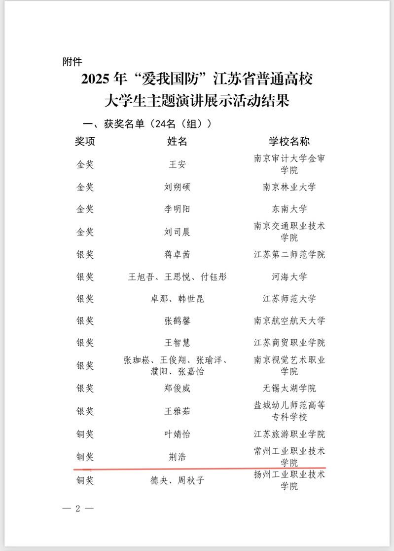 近日,2025年度江苏省国防教育和军事课教学系列赛事结果陆续揭晓,常州工业职业技术学院师生喜获多项佳绩,充分展现了学校国防教育的扎实成效与师生昂扬向上的精神风貌。