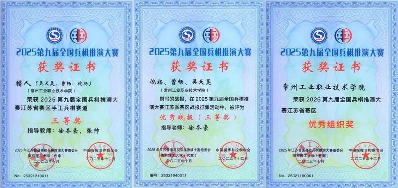 在由南京理工大学主办、南京大学及中国人民解放军陆军工程大学承办的2025年江苏省普通高校兵棋推演大赛上,学校首次亮相便取得不俗成绩。优秀学子倪扬、吴天昊、曹畅组成的代表队荣获手工兵棋赛道三等奖及“优秀战报奖”,学校获得“优秀组织奖”。兵棋推演有助于培养学生战略思维与协同能力,此次参赛也标志着我校在拓展国防教育实践形式、发挥退役大学生士兵特长方面取得了新的进展。
