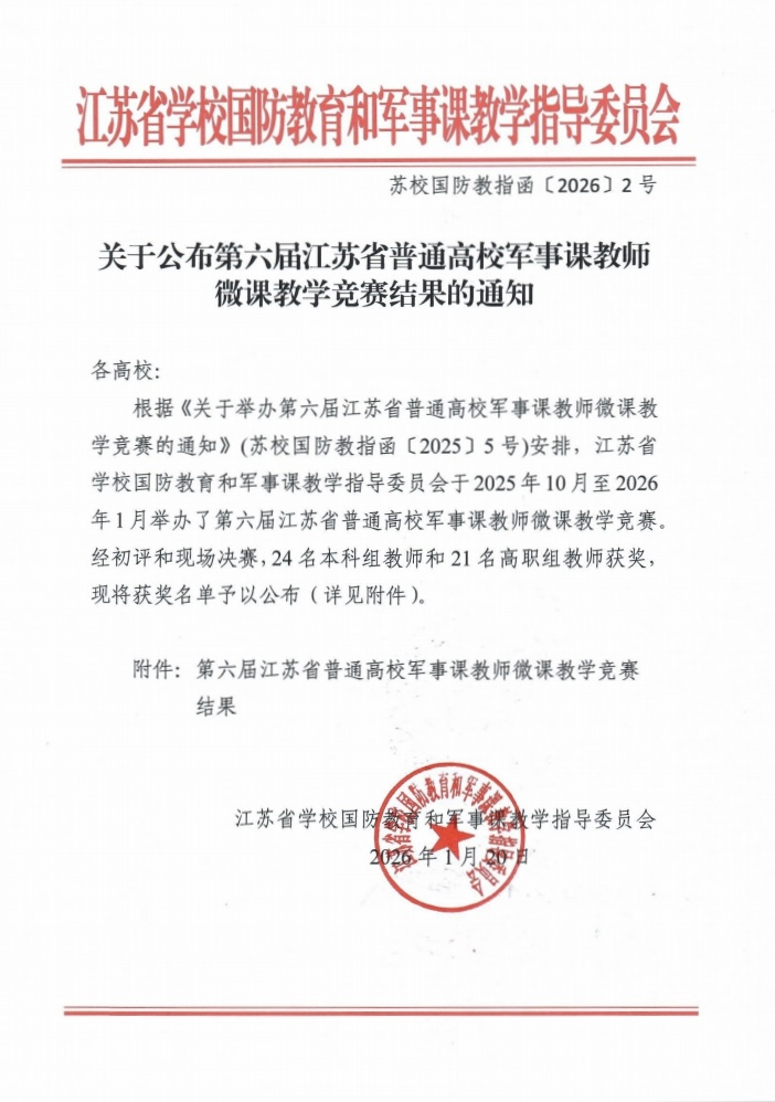 这是学校继第四、五届江苏省普通高校军事课教师微课教学竞赛一等奖和第八届、第九届江苏省普通高校军事课教师授课竞赛一等奖之后,在军事课教学领域取得的又一佳绩,是学校加强军事课教师队伍建设、提高军事理论课教学质量的重要成果。
