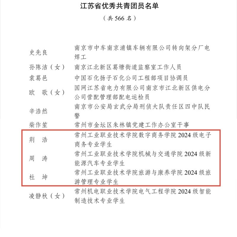 近日,共青团江苏省委公布了2025年全省“两红两优”表彰决定,常州工业职业技术学院数字商务学院2024级电子商务专业学生荆浩、机械与交通学院2024级新能源汽车专业学生周涛、旅游与康养学院2024级旅游管理专业学生杜坤等3名同学荣获省“优秀共青团员”称号。