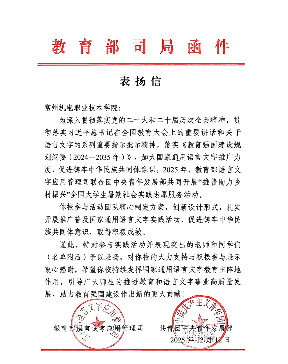 近日,教育部语言文字应用管理司、共青团中央青年发展部共同主办的2025年“推普助力乡村振兴”全国大学生暑期社会实践志愿服务活动评优结果揭晓,常州机电职业技术学院信息工程学院“五色风信子”燎原实践团荣获“优秀团队”称号并获教育部语言文字应用司和共青团中央青年发展部来信表扬。