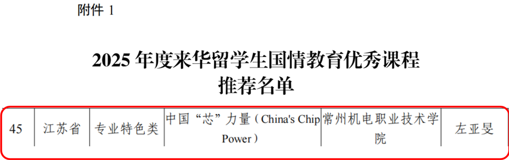 近日,教育部国际合作与交流司、中国教育国际交流协会公布了2025年度来华留学生国情教育优秀课程名单。常州机电职业技术学院信息工程学院左亚旻老师的《中国“芯”力量(China’s Chip Power)》课程成功入选,成为2025年江苏职业院校唯一入选的课程。