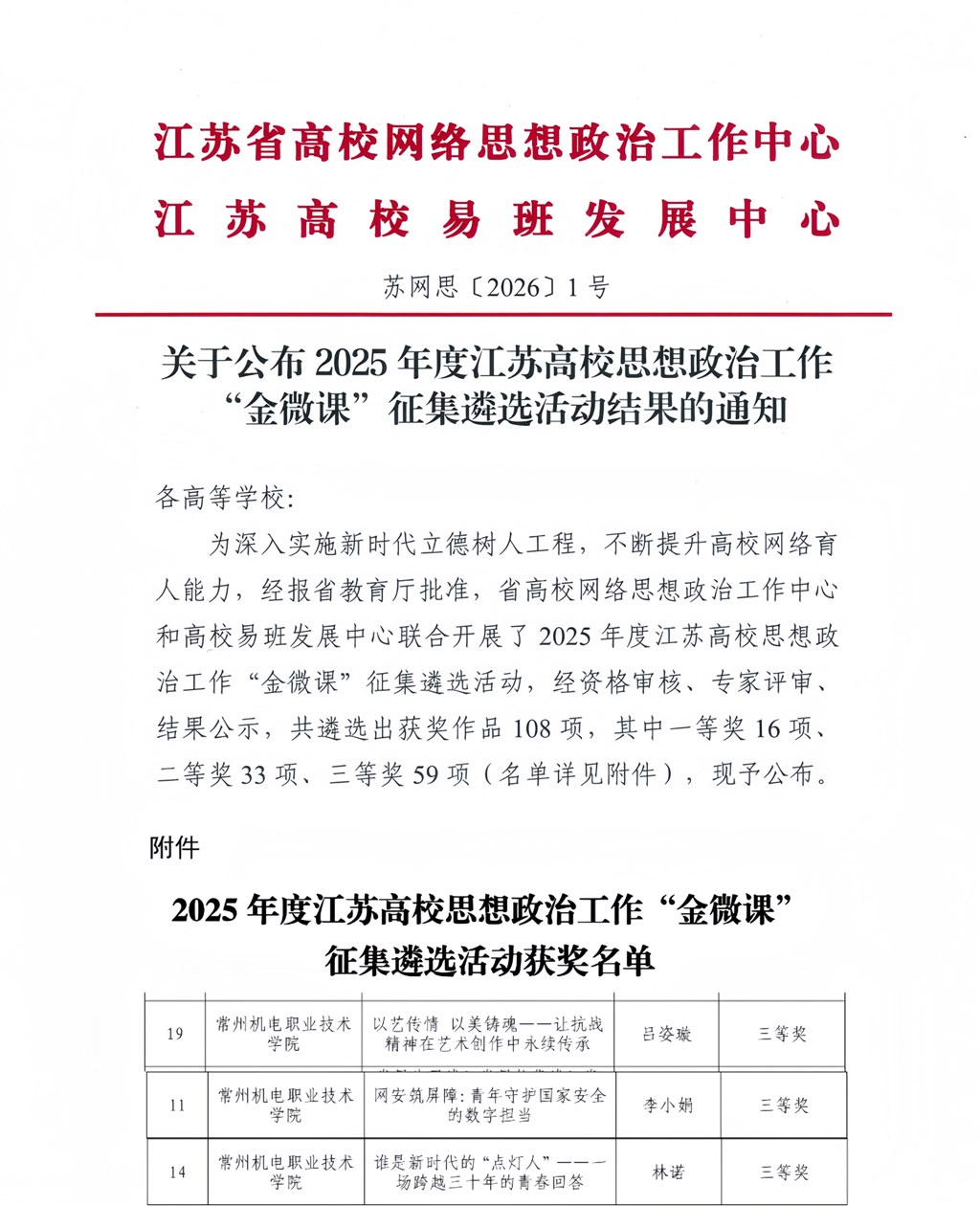 3月3日,江苏省高校网络思想政治工作中心和高校易班发展中心发布2025年度江苏高校思想政治工作“金微课”征集遴选活动结果,常州机电职业技术学院创意设计学院教师吕姿璇、电气工程学院教师李小娟、信息工程学院教师林诺的微课作品分获三等奖,充分展现了学校在网络思政工作领域的创新成果和实践成效。