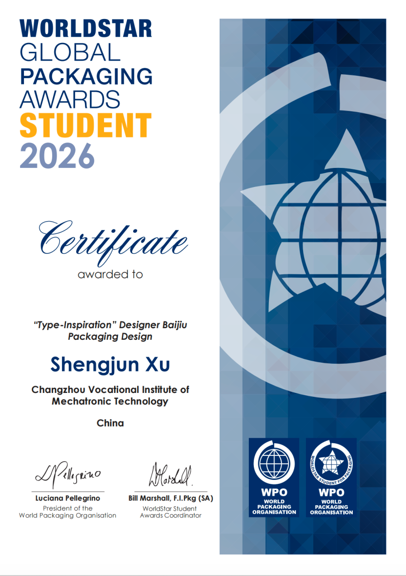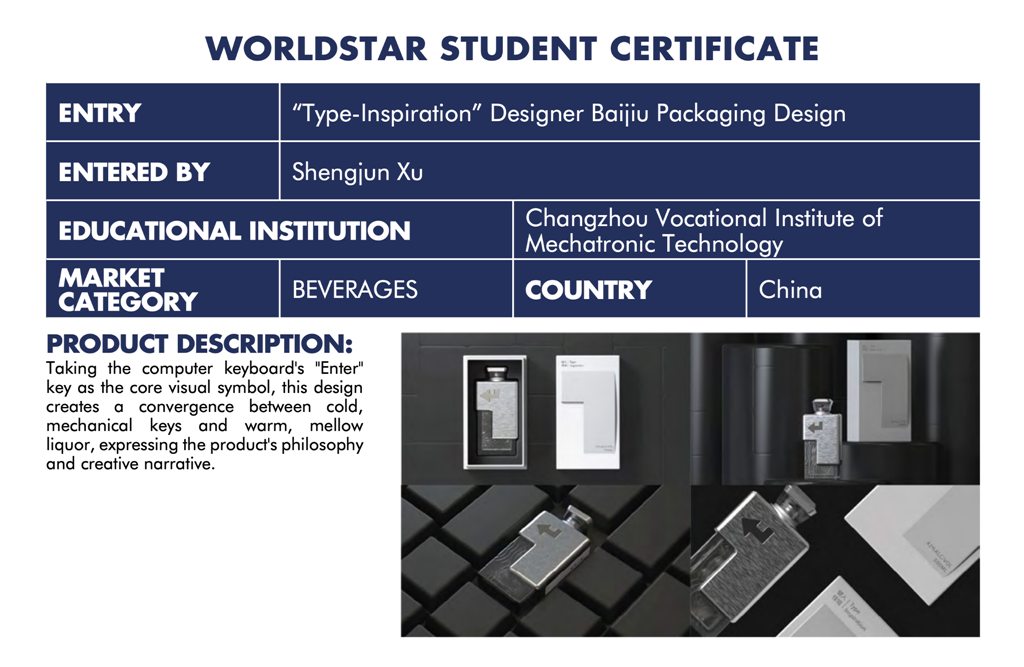 近日,2025年度“世界学生之星”(WorldStar Student)包装设计奖评选结果揭晓,常州机电职业技术学院创意设计学院刘智威老师指导、学生徐圣钧创作的作品《“键入佳境”设计师白酒包装》,凭借独特的创意理念与卓越的环保设计,从全球众多优秀作品中脱颖而出,斩获该项国际大奖。这是我校视觉传达设计专业在国际顶级赛事中首次获奖,实现了历史性突破。