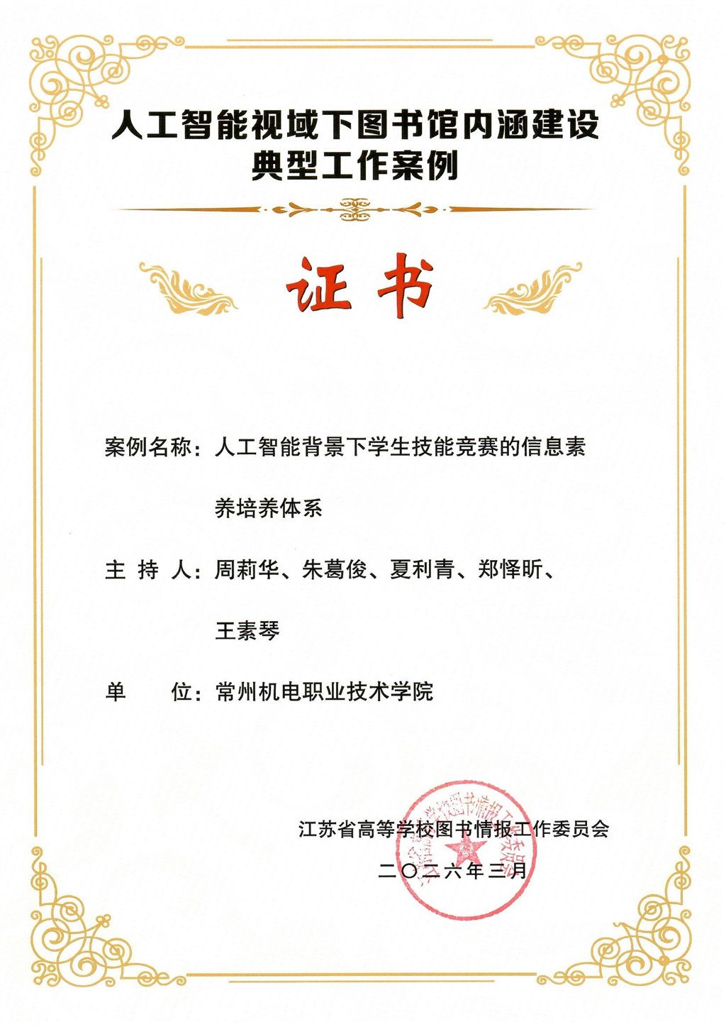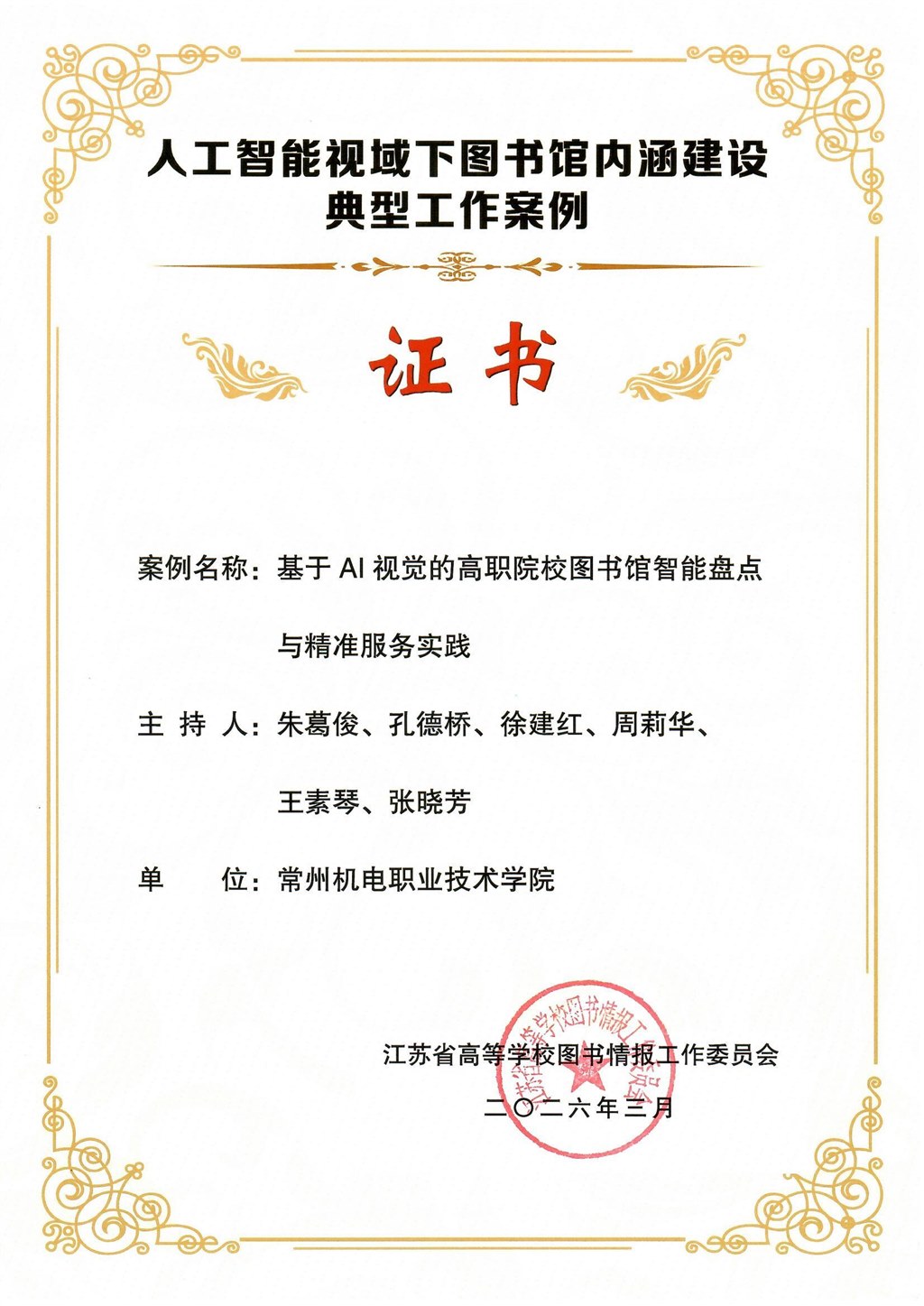 近日,由江苏省高等学校图书情报工作委员会、江苏省高校图工委高职高专图书馆建设专业委员会主办的“人工智能视域下图书馆内涵建设典型工作案例”评选结果公布,共有21个案例入选,其中6所学校获得两项入围资格,常州机电职业技术学院图书馆申报的《基于AI视觉的高职院校图书馆智能盘点与精准服务实践》与《人工智能背景下学生技能竞赛的信息素养培养体系》两项案例入选典型工作案例。