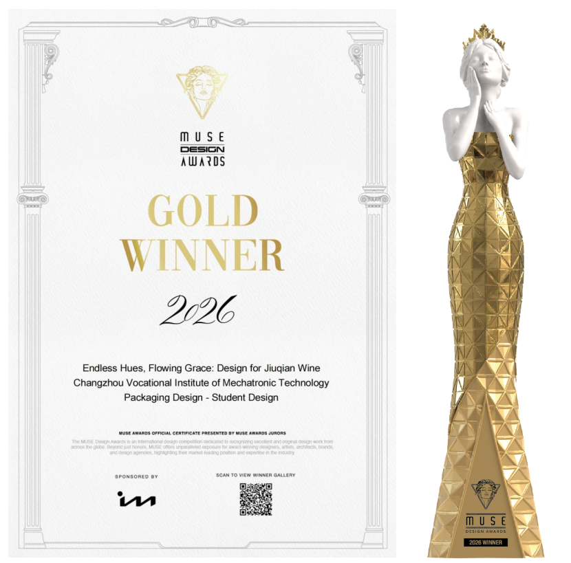 近日,2026年美国缪斯设计奖(MUSE Design Awards)获奖名单正式揭晓。常州机电职业技术学院创意设计学院周子涵同学的作品《Endless Hues, Flowing Grace: Packaging Design for Jiuqian Wine》凭借独特的设计理念与材料工艺,从全球100多个国家和地区的参赛作品中脱颖而出,荣获包装设计类金奖,指导老师为刘智威、樊旭。这是学院继去年在该赛项获得银奖后的新突破。