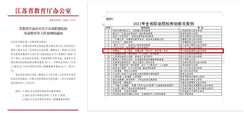 近日,在江苏省教育厅主办的2021 年劳动教育典型案例遴选活动中,我校选送的《厚德在心匠心琢玉构建出彩“棉文化”劳动育人体系》案例,经过选拔,成为15所高职院校优秀案例之一。