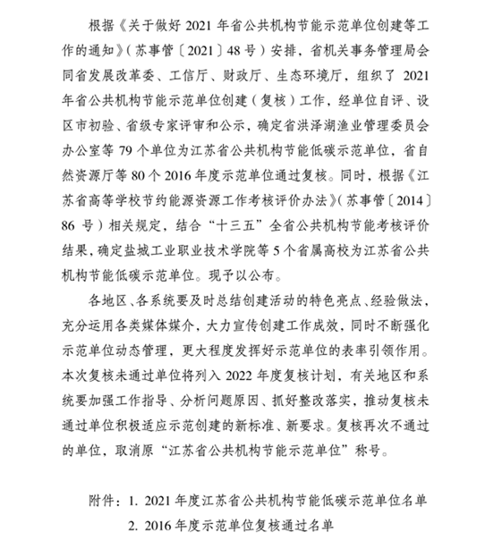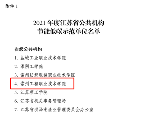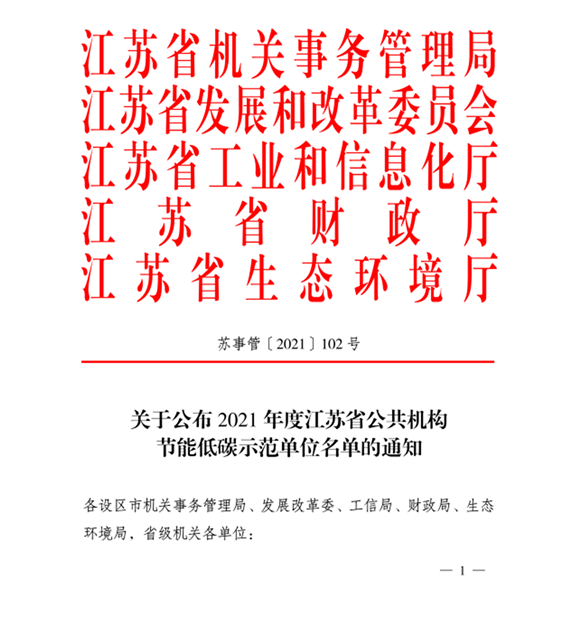 近日,根据《关于做好2021年省公共机构节能示范单位创建等工作的通知》(苏事管〔2021〕48号)安排,省机关事务管理局、发展和改革委员会、工业和信息化厅、省财政厅、省生态环境厅联合组织了2021年省公共机构节能示范单位创建(复核)工作。按照《江苏省高等学校节约能源资源工作考核评价办法》(苏事管〔2014〕86号)相关规定,结合“十三五”全省公共机构节能考核评价结果,我校被评为 “江苏省公共机构节能低碳示范单位”,本次仅有五所省属高校获此荣誉。