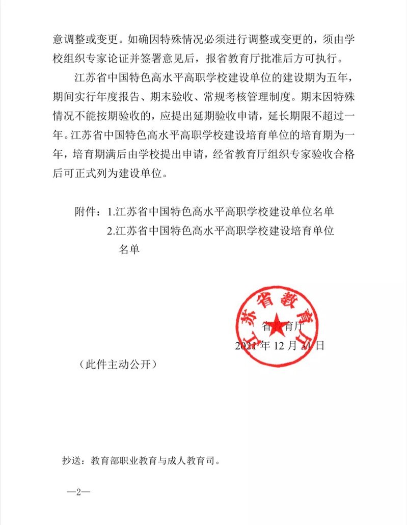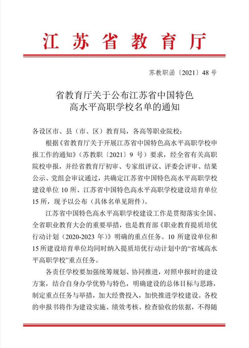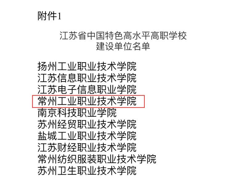 根据省教育厅文件《省教育厅关于公布江苏省中国特色高水平高职学校名单的通知》,我校成功入选江苏省中国特色高水平高职学校建设单位名单。这标志着我校在“十四五”开局之年正式迈入省高水平高职学校行列,既是对学校综合实力的极大肯定,也是对常工业人自强不息、砥砺前行奋斗精神的极大鼓励。学校事业发展将站在一个全新平台之上,美誉度和影响力上升到一个更高层次,对学校未来发展具有里程碑意义和深远历史价值。