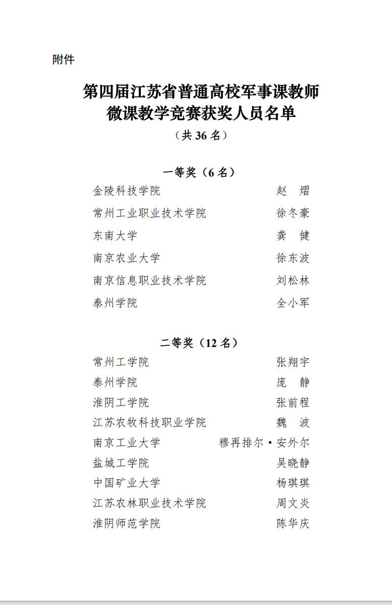 近日,第四届江苏省普通高校军事课教师微课教学竞赛决赛在南京师范大学举行,我校人武部军事课教师徐冬豪从全省普通高校近百名军事课教师中脱颖而出,以决赛第2名的成绩荣获一等奖。