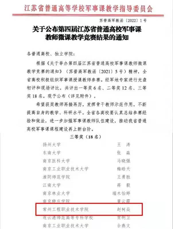 1月8日,由江苏省普通高等学校军事课教学指导委员会主办的“第四届江苏省普通高校军事课教师微课教学竞赛决赛”在南京师范大学仙林校区国际学术交流中心落下帷幕。常州工程职业技术学院的军事教研室教师赵柯焱喜获三等奖。