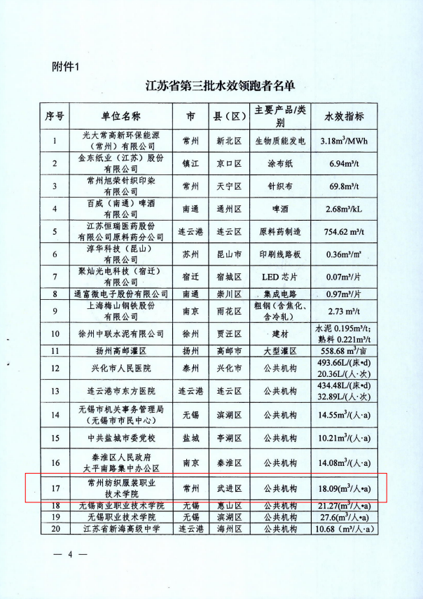 常州纺织服装职业技术学院被评为“江苏省水效领跑者”,本次评审由省水利厅、省发展和改革委员会、省工业和信息化厅、省财政厅、省住房和城乡建设厅、省市场监督管理局、省机关事务管理局七部门组织,学校为常州高校中唯一获此殊荣的单位。