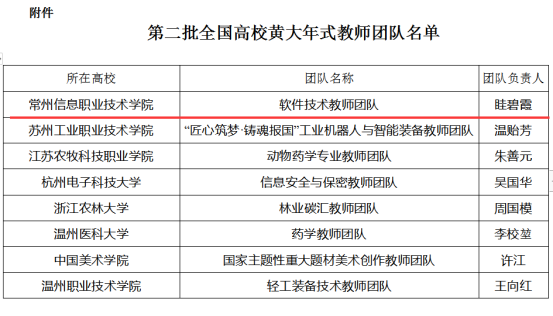 近日,教育部印发通知,公布第二批全国高校黄大年式教师团队,常州信息职业技术学院的校长眭碧霞教授领衔的“软件技术教师团队”成功入选。