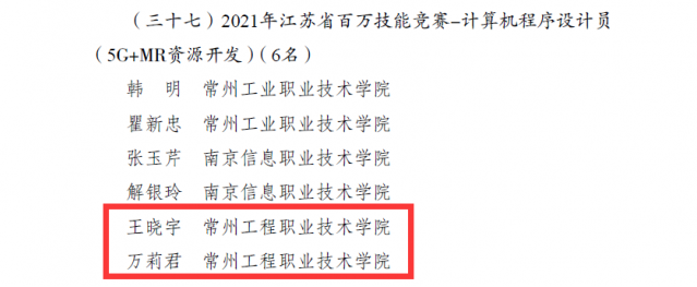 在2021年12月举行的江苏省百万技能人才技能竞赛决赛中,王晓宇、万莉君两位教师参加了“计算机程序设计员(5G+MR 资源开发)”教工组赛项,最终从众多代表队中脱颖而出,获得总成绩第三名的好成绩。同时,所指导的学生参加学生组比赛也获得三等奖。