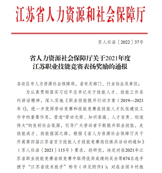 近日,江苏省人力资源和社会保障厅发布文件《省人力资源和社会保障厅关于2021年度江苏职业技能竞赛表扬奖励的通报》(苏人社函〔2022〕37号)。常州工程职业技术学院的设计艺术学院王晓宇、万莉君两名教师因在2021年江苏省职业技能竞赛省级竞赛中取得优异成绩被授予“江苏省技术能手”荣誉称号。