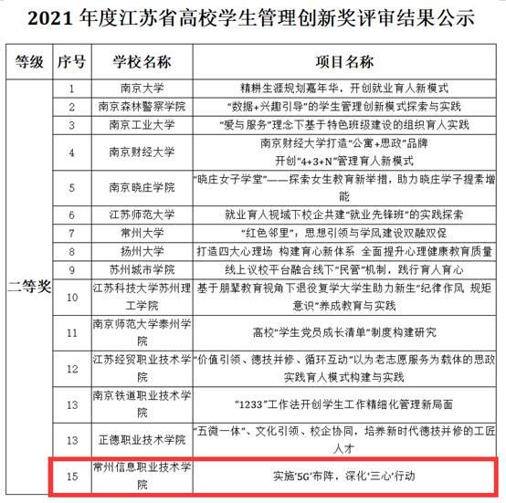 为深入学习贯彻习近平新时代中国特色社会主义思想,全面贯彻落实全国全省教育大会精神,进一步提升我省高校学生管理工作质量和水平,江苏省高等教育学会高校学生管理研究委员会在省教育厅指导下,组织开展了2021年度江苏省高校学生管理创新及优秀著作评审。经过学校推荐、专家会评,最终评审出“创新奖”一等奖10项、二等奖15项、三等奖20项。其中常州信息职业技术学院申报的《实施‘5G’布阵,深化‘三心’行动》项目获得高校学生管理“创新奖”二等奖。