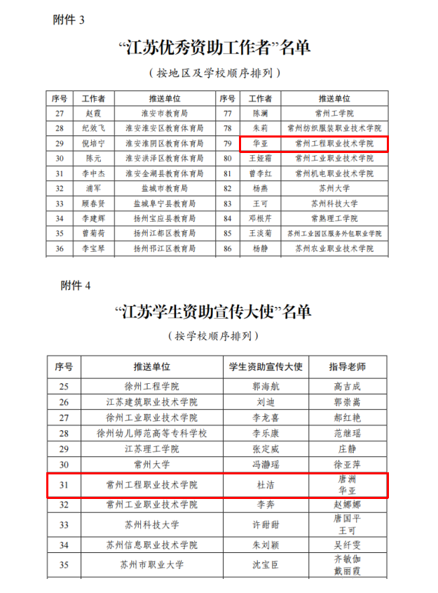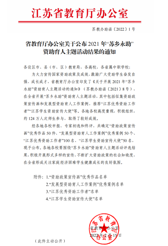 近日,江苏省教育厅办公室印发《关于公布2021年“苏乡永助”资助育人主题活动结果的通知》(苏教办助函〔2022〕1号)。常州工程职业技术学院的学工部华亚老师常年在资助一线勤恳耕耘,热心学生资助事业,认真钻研和创新学生资助工作,荣获“江苏优秀资助工作者”称号。检验检测认证学院学生杜洁在辅导员唐洲老师和学工部华亚老师的精心指导下,充分利用校内外各方力量,并结合实际,开展形式创新、重点突出、反响较好的资助政策宣传活动,扩大了资助政策的知晓度,荣获“江苏学生资助宣传大使”称号。